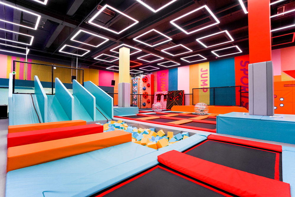 館主對蹦床館內裝修設計這塊也是下足了功夫,可以通過以下圖片看到館內豐富多彩的色調搭配,充滿活力又不失格調,在讓人心情愉悅的同時,對設備充滿好奇心,探索欲,把蹦床主題公園性能發揮到了極致。