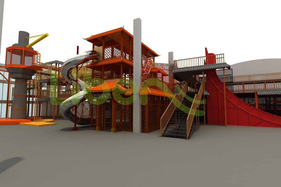 立本設(shè)計(jì)團(tuán)隊(duì)以武漢當(dāng)?shù)氐娘L(fēng)土人情建筑風(fēng)格為靈感來源,打造了頗具地域文化的樓宇風(fēng)格場館,一條不銹鋼滑梯帶你領(lǐng)略場館從上而下帶來的快感,左邊是以長江大橋?yàn)樵?/span>型的木質(zhì)長廊,連接著以龜山電視塔為原型的立本攀爬區(qū)