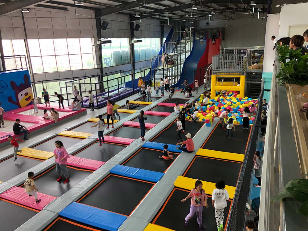 一部分蹦床在地面采用了充氣軟墊,一部分則采用了軟性橡膠,當然,周邊的設施主要是防沖擊網。