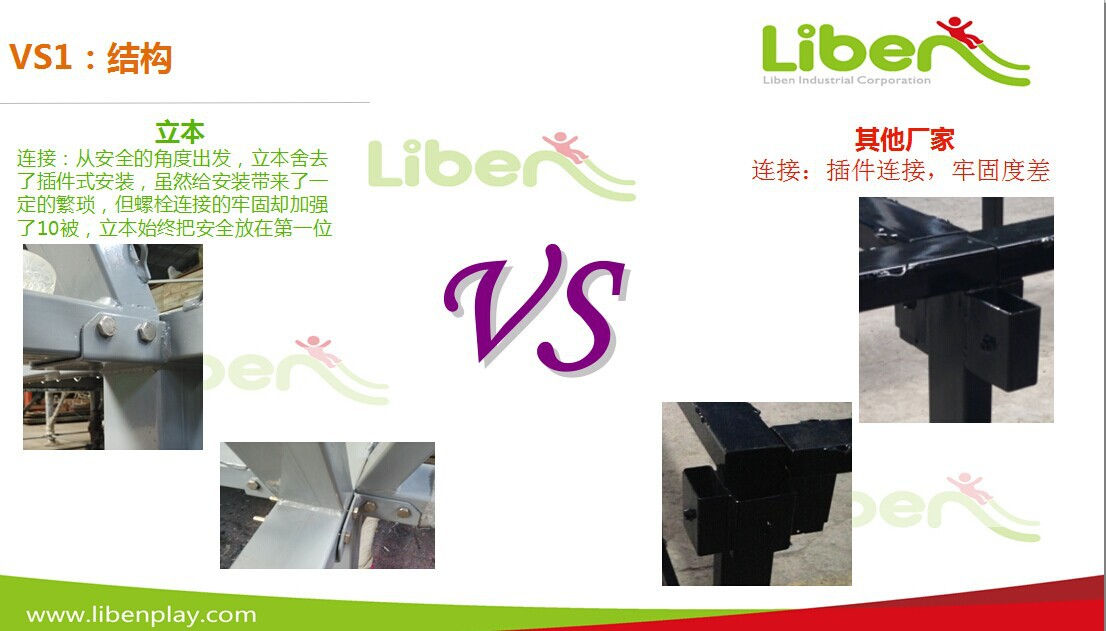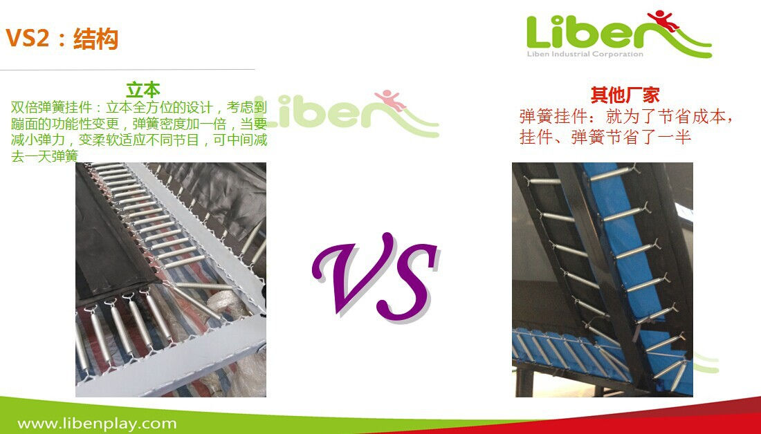 1.跳墊:美國進口蹦床墊 2.塑粉:來自荷蘭阿克蘇塑粉 3.軟包:珍珠綿+高彈力海綿結構 4.框架:12*6cm, 10*10cm, 厚度是3.0mm的熱鍍鋅管 5.彈簧:采用琴鋼絲材質,抗變形拉伸長度是錳鋼的5倍 |