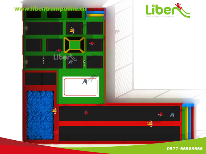 蹦床,根據(jù)不同的年齡可設(shè)計(jì)不同的功能區(qū)域,最普通的是自由彈跳區(qū)域,還有躲避球區(qū)域,蜘蛛塔區(qū)域,專業(yè)蹦床等各種不同區(qū)域,這些區(qū)域可根據(jù)客人要求設(shè)計(jì)布局